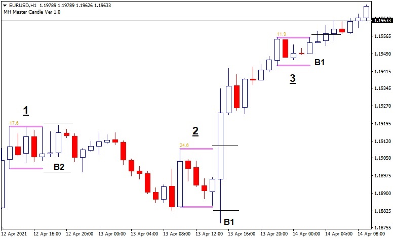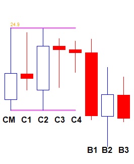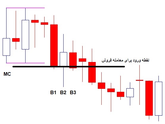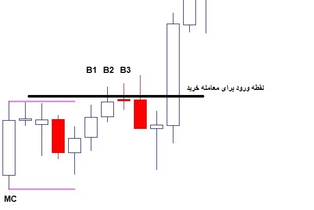 بعد از تشکیل الگوی 5 کندلی اولیه که به عنوان Master Candle شناخته میشود منتظر تشکیل 3 کندل بعد از آن میمانیم. کندلهای تشکیل شده بعد از C4 به نام B3 ,B2 , B1 نام گذاری میگردد که هر کدام از این کندلهای در صورتی که موفق به شکست حد بالا یا پایین خطوط Master Candle گردید میتوان وارد پوزیشن خرید یا فروش گردید با شرایطی که در ادامه ذکر میگردد: