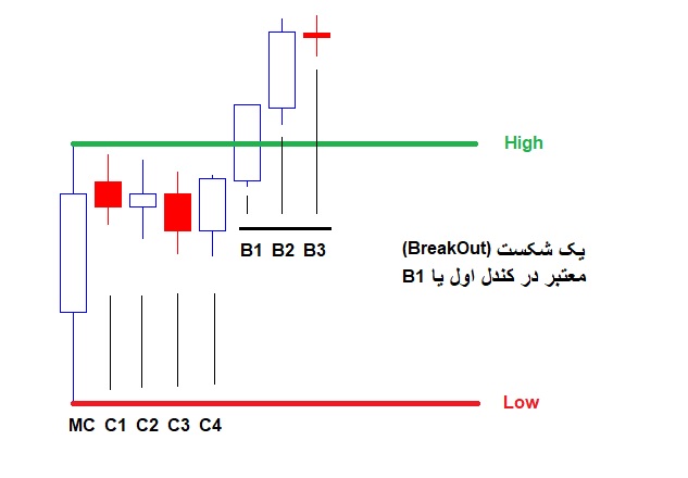 در استراتژی عنوان شده در این سایت معنی شکست به صورت معتبر یا غیر معتبر مطرح نمیباشد فقط شکست و بسته شدن یکی از کندلهای شماره 1 تا 3 در خارج خط HIGH و یا LOW یک Master Candle سیگنال ورود به معامله خرید یا فروش میباشد حال این کندل از یکی از کندلهای B3 ,B2 , B1 به صورت 50 %بدنه خط SUPPORT و یا RESISTANCE کندل مادر یا Master Candle را بشکند و یا خیر و خروج و بسته شدن در خارج از Low or HIGH یک Master Candler سیگنال ورود را صادر مینماید.