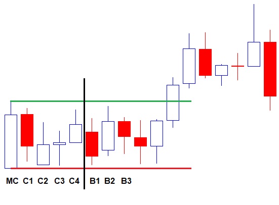 در صورت شکل گیری چنین الگوی 5 کندلی با شرایط ذکر شده مرحله اول استراتژی ورود به معامله بر این اساس تکمیل میگردد. کندل اول در سمت چپ به عنوان Master Candle و به صورت اختصار با MC نام گذاری شده و کندلهای بعدی به شماره های 1 و 2 و 3 و4 با ….,C1 ,C2 نام گذاری گردیده است.