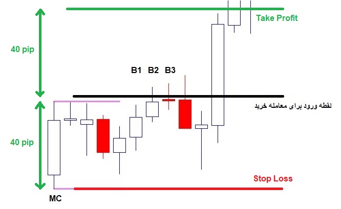 به طور مثال اگر ارتفاع Master Candle ما 40 پیپ بود مقدار حد سود را همان 40 پیپ از مستر کندل مشخص میکنیم.