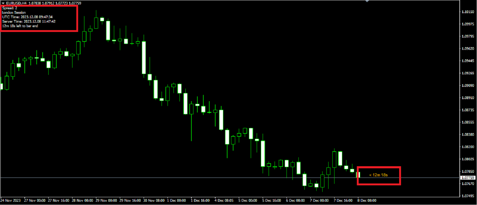 اندیکاتور کاملا رایگان MHi BarClock برای نمایش ساعت سرور و زمان باقی مانده برای بسته شدن کندل جاری در تایم فریم فعلی به کار می رود.