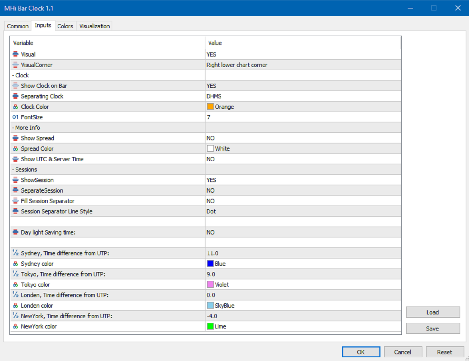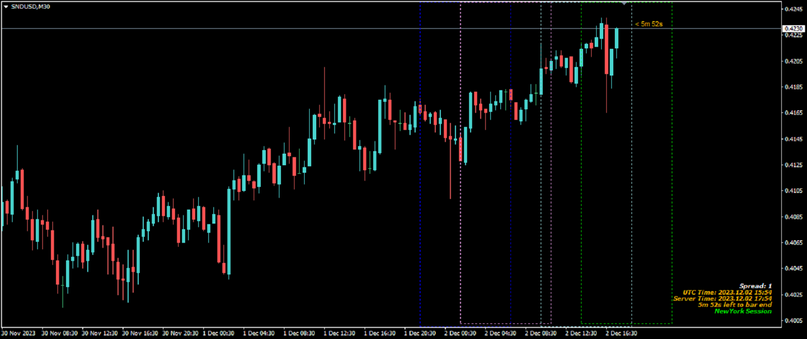 شکل 3 –اندیکاتور در حالت ویژوال (Visual) نشان داده شده است. که در آن زمان باز و بسته شدن چهار بازار جهانی (سیدنی، ژاپن، لندن، نیویورک) نیز نمایش داده می شود.